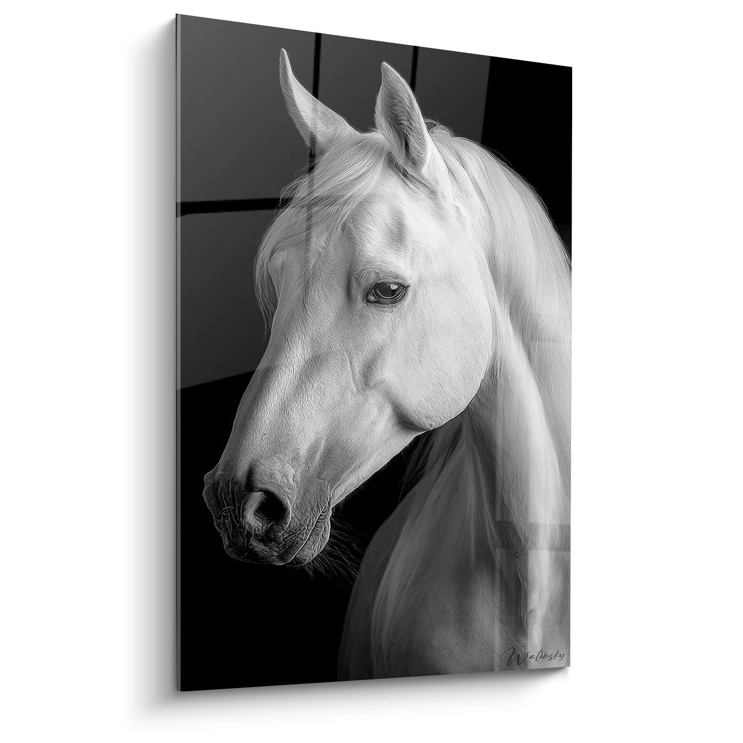 Dieses Wandbild reiht sich in die große Tradition der Pferdedarstellung in der bildenden Kunst ein, die von klassischen Meistern wie George Stubbs bis zu zeitgenössischen Tierfotografen reicht. Die monochrome Technik erinnert an die großen Portrait-Traditionen der Fotografie und verleiht dem Werk museale Qualität. Ideal für Pferdeliebhaber und Kunstsammler gleichermaßen.