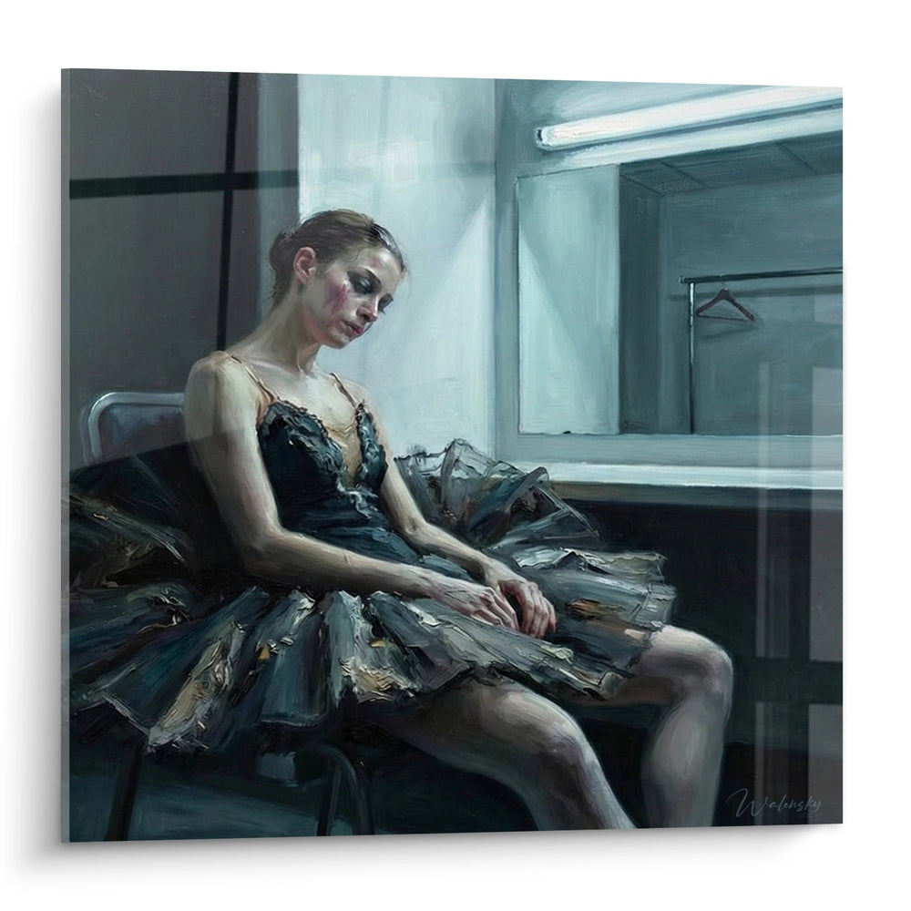 Dieses bewegende Wandbild zeigt eine junge Ballerina in einem intimen Moment nach der Aufführung. Die Tänzerin sitzt erschöpft in ihrer dunklen Tutu-Robe in der kargen Umkleidekabine und verkörpert die Melancholie, die oft dem Rampenlicht folgt. Das Gemälde fängt die Dualität des Balletts ein - die Schönheit der Kunst und die körperliche sowie emotionale Erschöpfung dahinter. Die realistische Malweise unterstreicht die Verletzlichkeit der Figur, während das kalte Licht der Umkleidekabine eine beinahe surreale Atmosphäre schafft. Dieses Kunstwerk spricht jeden an, der die Welt des Tanzes liebt und die menschliche Seite hinter der Perfektion zu schätzen weiß. Die feinen Details des zerrissenen Tutus und die nachdenkliche Haltung der Ballerina machen dieses Wandbild zu einem emotional aufgeladenen Kunstwerk für moderne Wohnräume.