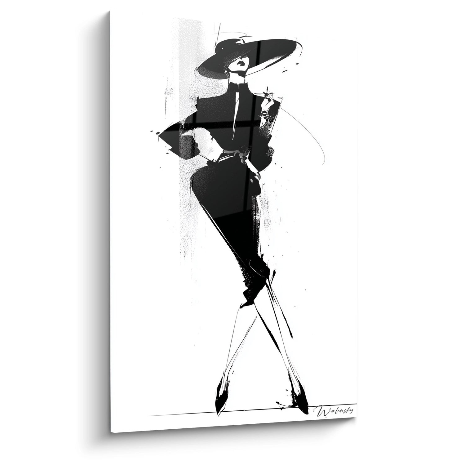 Dieses faszinierende Wandbild zeigt die elegante Silhouette einer Frau mit einem ausladenden Hut in minimalistischer Schwarz-Weiß-Ästhetik. Die abstrakte Darstellung kombiniert kraftvolle schwarze Pinselstriche mit fließenden weißen Konturen, die eine zeitlose Eleganz ausstrahlen. Die Figur wirkt dynamisch und selbstbewusst, mit langen, schlanken Beinen und einer aufrechten Haltung, die Stärke und Grazie vereint. Der markante Hut verleiht der Komposition einen Hauch von Vintage-Glamour und mysteriöser Ausstrahlung. Diese abstrakte Schwarz-Weiß-Figur eignet sich perfekt für moderne Wohnräume, Ankleidezimmer oder Büros, wo sie als eleganter Blickfang fungiert. Die reduzierte Farbpalette ermöglicht eine harmonische Integration in verschiedenste Einrichtungsstile, von minimalistisch bis luxuriös. Die künstlerische Technik erinnert an Modeillustration und zeitgenössische Grafik, wodurch das Wandbild sowohl klassische als auch moderne Elemente vereint.