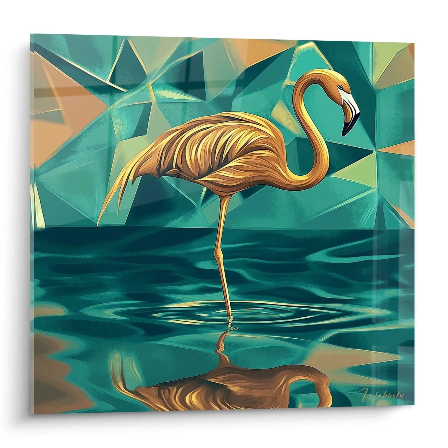 Wandbild Flamingo Geometrisch - Goldener Flamingo im Kristallwasser - Edition Flamingo