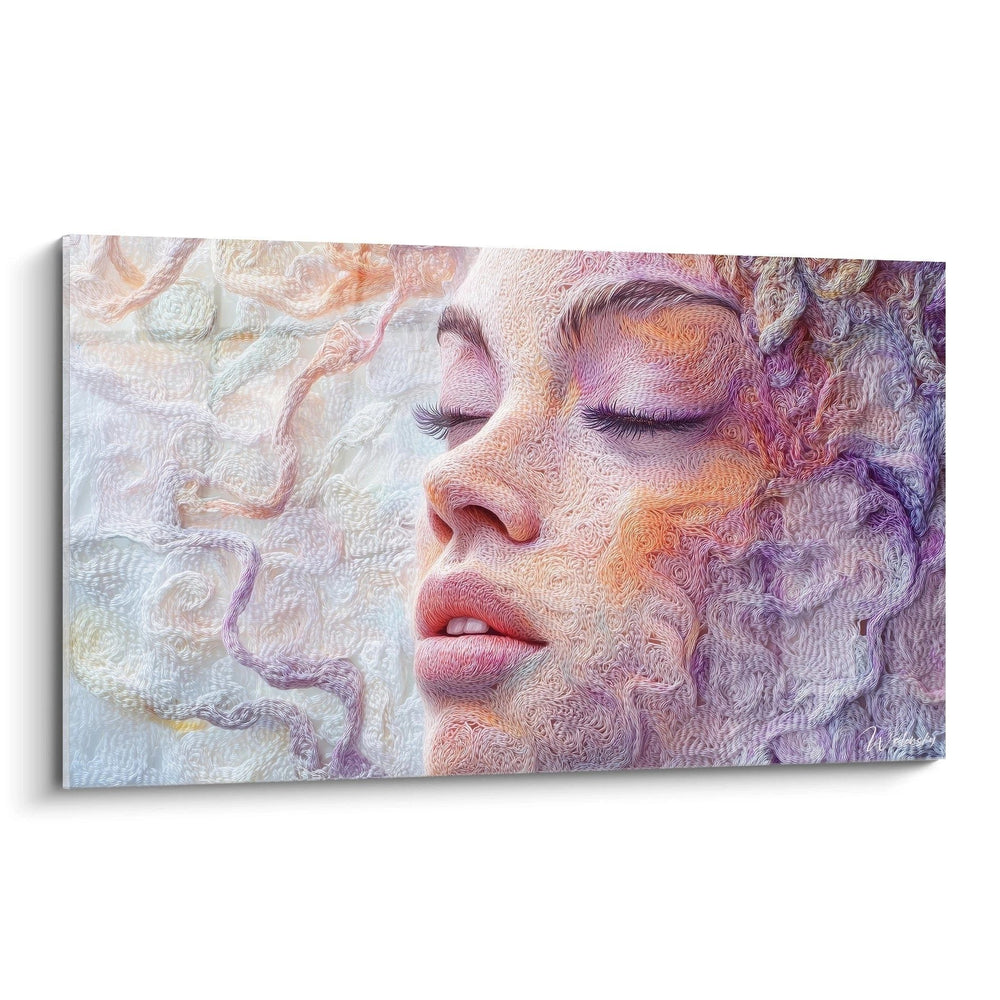 Dieses außergewöhnliche Wandbild zeigt das Portrait einer friedlich wirkenden Frau mit geschlossenen Augen in der charakteristischen Häkeloptik. Die innovative Darstellungstechnik verwandelt jede Linie und jeden Farbübergang in kunstvolle, textile Strukturen, die an handgefertigte Häkelarbeiten erinnern. Das Gesicht der Frau strahlt pure Ruhe und Gelassenheit aus, während ihre sanft geschlossenen Augen von langen, dunklen Wimpern umrahmt werden. Die lockigen Haare fließen wie textile Wellen um ihr Gesicht und verstärken den träumerischen Charakter des Kunstwerks. Jedes Detail, von der zarten Nasenpartie bis hin zu den weichen Lippen, wird durch die Häkeloptik in eine einzigartige Textur verwandelt, die sowohl visuell als auch haptisch ansprechend wirkt. Diese moderne Interpretation klassischer Portraitkunst schafft eine perfekte Balance zwischen zeitgenössischer Ästhetik und handwerklicher Tradition.