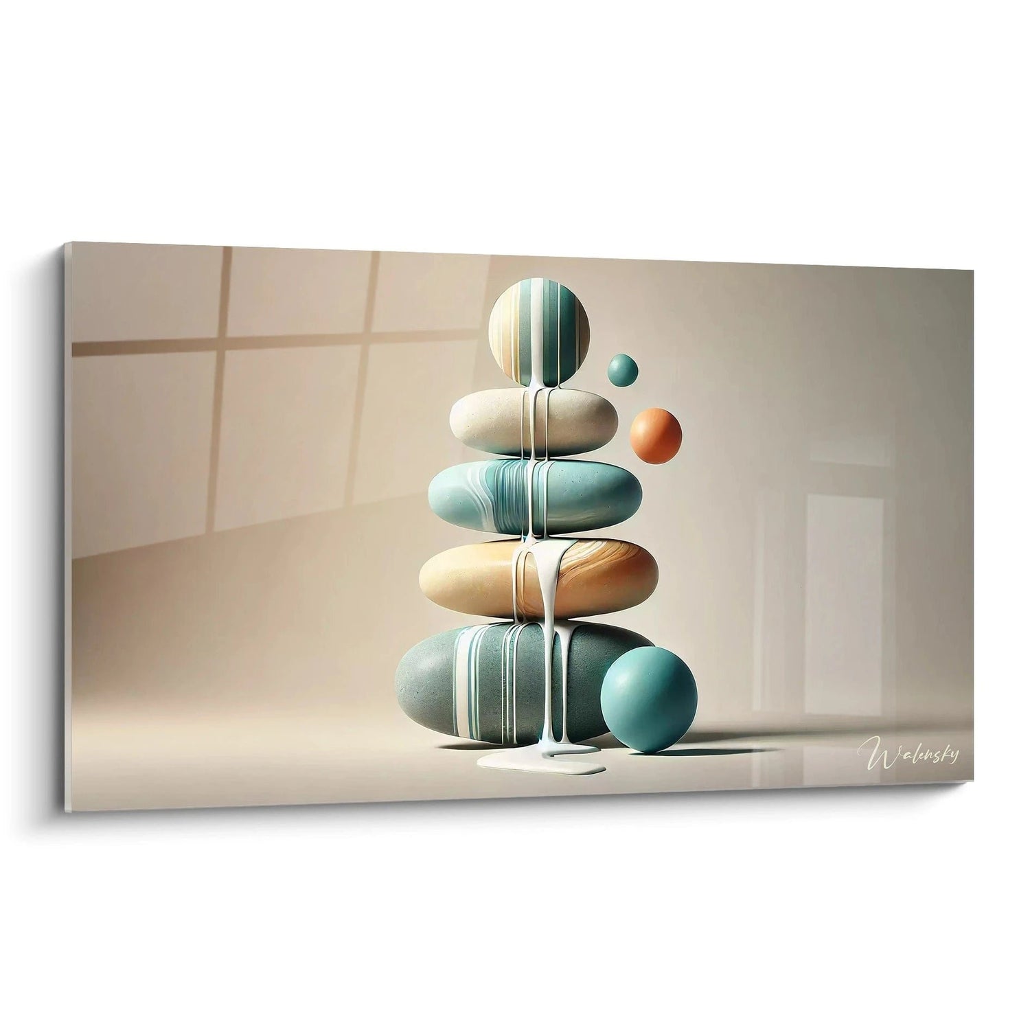 Dieses außergewöhnliche Wandbild zeigt eine kunstvolle Komposition aus gestapelten Zen-Steinen, die perfekte Balance und innere Ruhe symbolisieren. Die ovalen Steine in harmonischen Farbtönen von sanftem Türkis, warmem Beige bis hin zu erdigen Brauntönen sind präzise aufeinandergeschichtet und vermitteln ein Gefühl von Stabilität und Meditation. Ergänzt wird die Komposition durch schwebende Kugeln in verschiedenen Größen, die das Spiel von Leichtigkeit und Schwere verdeutlichen. Der warme, weiche Hintergrund mit dezenten Lichtreflexen schafft eine beruhigende Atmosphäre, die zum Verweilen und Meditieren einlädt. Das minimalistische Design mit seinen klaren Linien und der durchdachten Farbpalette macht dieses Kunstwerk zu einem perfekten Element für moderne Wohnräume, Yoga-Studios oder Entspannungsbereiche. Die subtile Beleuchtung verstärkt die dreidimensionale Wirkung der Steine und verleiht dem Bild eine fast meditative Ausstrahlung.