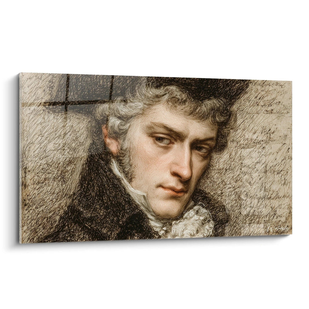 Dieses außergewöhnliche Wandbild präsentiert ein meisterhaft ausgeführtes Herrenporträt aus dem 18. Jahrhundert, das die Eleganz und Würde der Ludwig XVI-Epoche verkörpert. Das Kunstwerk zeigt einen distinguierten Herrn mit charakteristischen lockigen Haaren und feinen Gesichtszügen, gekleidet in die typische Mode der Zeit mit einem dunklen Gewand und weißer Halsbinde. Die virtuose Zeichentechnik mit feinen Schraffuren und subtilen Schattierungen verleiht dem Portrait eine beeindruckende Tiefe und Lebendigkeit. Der warme, sepiafarbene Grundton unterstreicht den historischen Charakter und schafft eine zeitlose Ausstrahlung. Jede Linie und jeder Strich wurde mit höchster Präzision ausgeführt, wodurch die Persönlichkeit und der Charakter des Porträtierten authentisch zum Ausdruck kommen. Diese kunstvolle Darstellung eignet sich hervorragend für klassische Wohnräume, Bibliotheken oder Arbeitszimmer, wo sie eine Atmosphäre von Bildung und Raffinesse schafft.