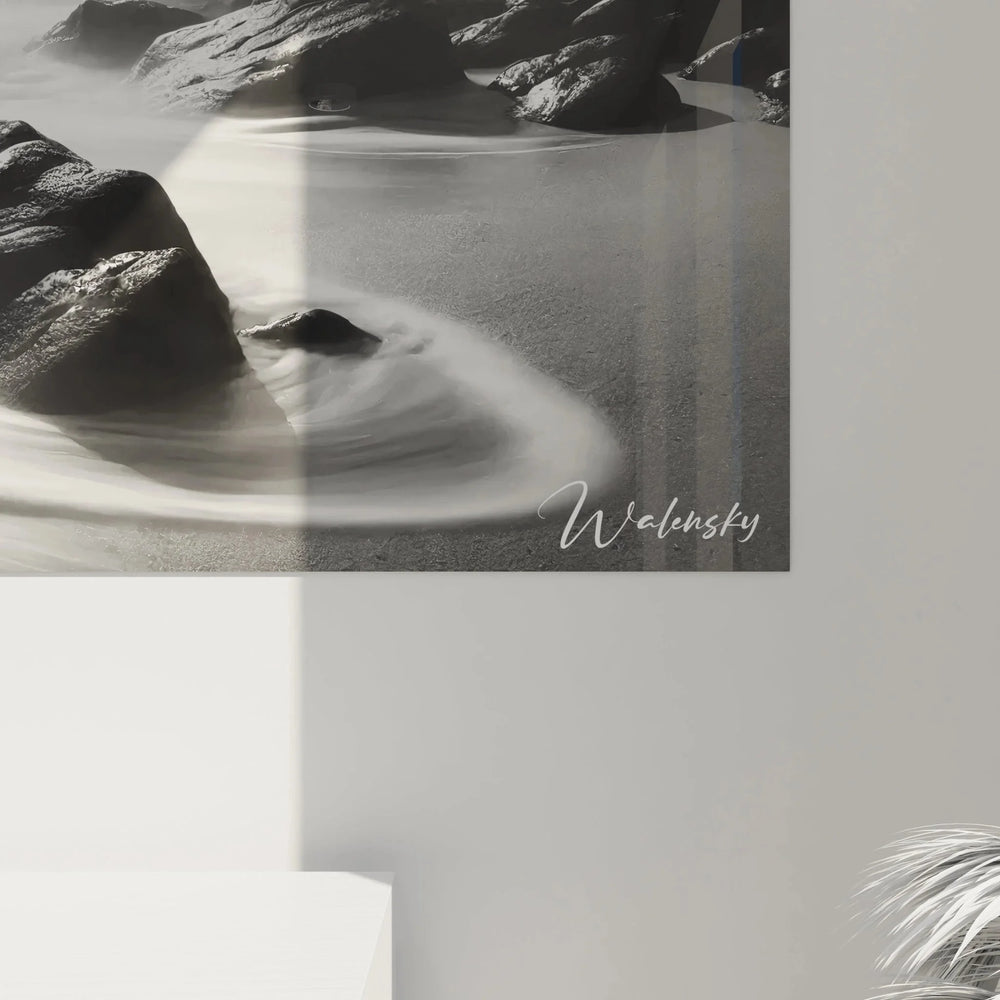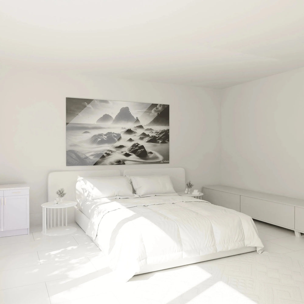Wandbild Küste - Mystische Felsenformation im Nebel - Edition Landschaften schwarz-weiß