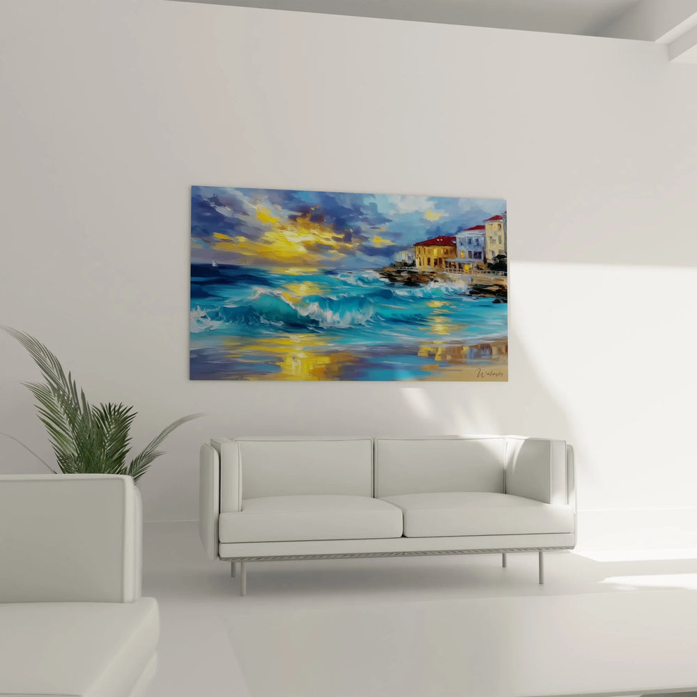 Wandbild Küstenstadt Sonnenuntergang - Mediterrane Brandung - Edition Strand