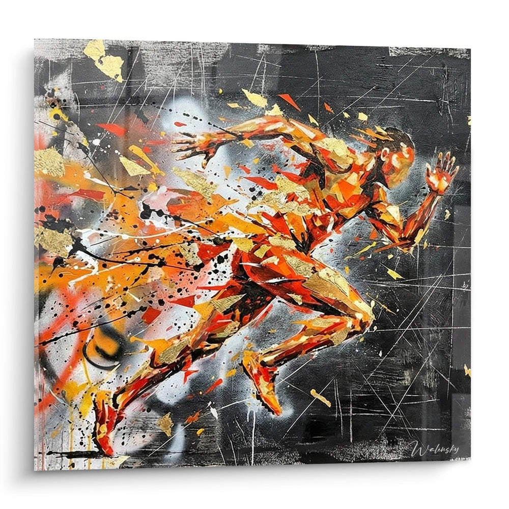 Die dominierenden Farben Orange, Rot und Gold symbolisieren Energie, Leidenschaft und den Triumph des menschlichen Willens. Diese warmen Töne stehen im starken Kontrast zum dunklen, fast schwarzen Hintergrund, der die Intensität der Bewegung noch verstärkt. Die fragmentierte Darstellung des Läufers steht für die Überwindung von Grenzen und die Transformation durch Sport. Gold-Akzente verleihen dem Werk eine edle Note und symbolisieren den Erfolg und die Belohnung für harte Arbeit.
