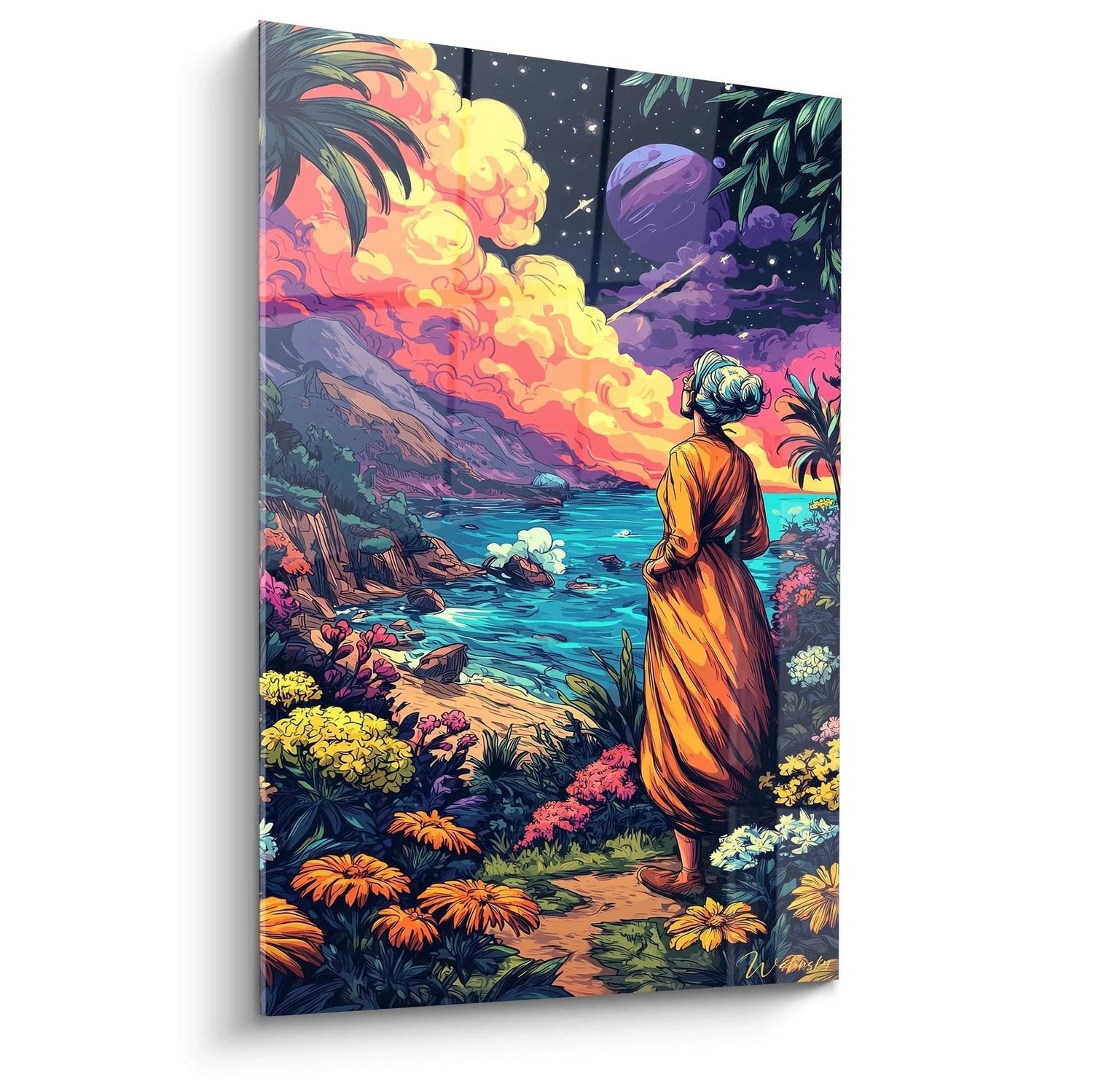 Die warmen Orange- und Gelbtöne der Mönchsrobe symbolisieren Weisheit und spirituelle Erleuchtung, während das beruhigende Türkisblau des Ozeans für Frieden und Meditation steht. Der sternenklare Himmel mit seinen dramatischen Wolkenformationen repräsentiert die Verbindung zwischen Erde und Kosmos. Die lebendigen Farben der tropischen Flora verstärken das Gefühl von Lebendigkeit und natürlicher Harmonie in dieser spirituellen Oase.