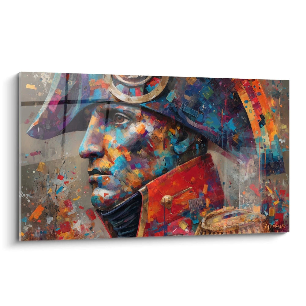 Die leuchtende Farbpalette aus Orange, Blau, Rot und Gold symbolisiert die Komplexität von Napoleons Persönlichkeit und seinem historischen Erbe. Die warmen Rottöne seiner Uniform stehen für Macht und Leidenschaft, während die blauen Elemente Weisheit und strategisches Denken repräsentieren. Die goldenen Akzente verweisen auf seinen kaiserlichen Status und seine bleibenden Errungenschaften. Die abstrakte Fragmentierung des Bildes spiegelt die vielschichtige Natur seiner historischen Figur wider.