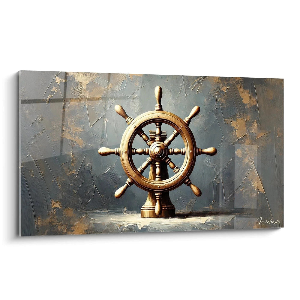 Das Schiffssteuerrad symbolisiert Führung, Kontrolle und die Beherrschung der Meere. Die bronze-goldenen Töne strahlen Wärme und Eleganz aus, während der neutrale Hintergrund das maritime Element in den Fokus rückt. Diese Farbkombination vermittelt sowohl Tradition als auch zeitlose Sophistikation und eignet sich hervorragend für klassische und moderne Einrichtungsstile.