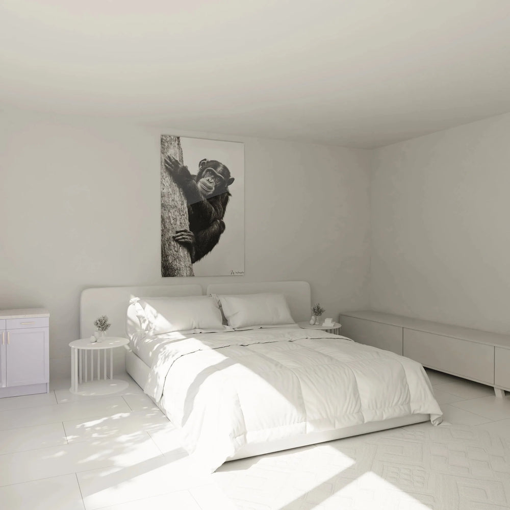 Wandbild Schimpanse - Kletternder Affe am Baumstamm - Edition Tiere schwarz-weiß