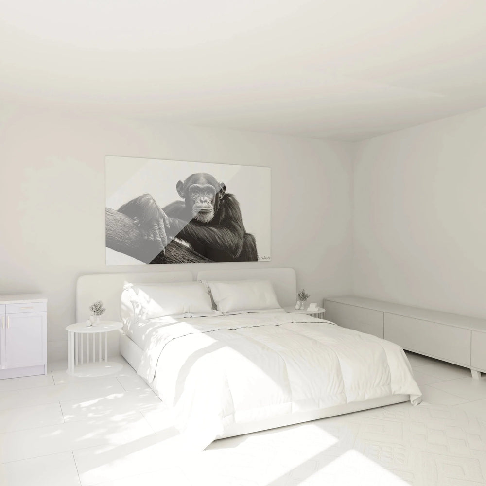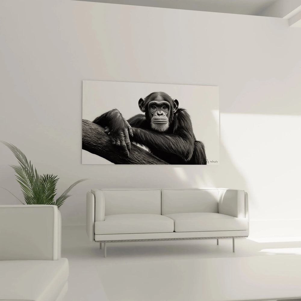 Wandbild Schimpanse - Nachdenklicher Primat auf Ast - Edition Tiere schwarz-weiß