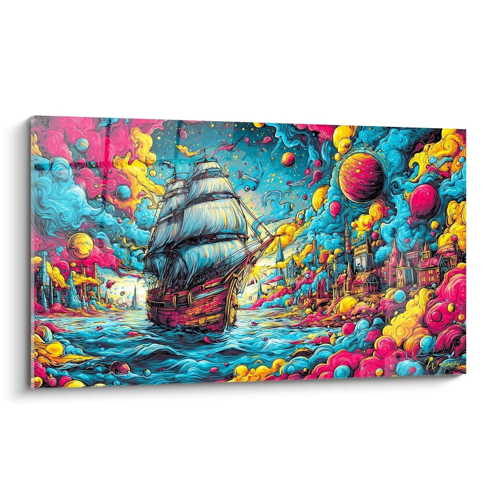 Tags: Segelschiff Wandbild, Psychedelische Kunst, Farbexplosion Deko, Maritime Kunstwerke, Kosmische Malerei