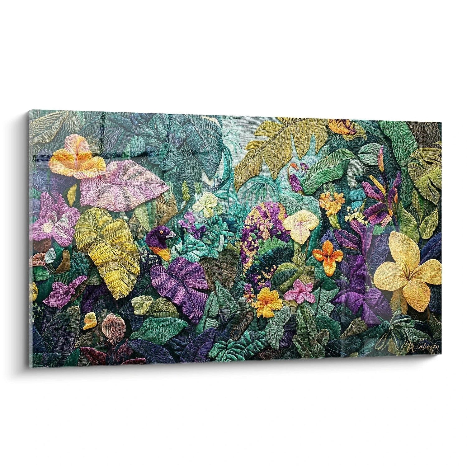 Dieses außergewöhnliche Wandbild entführt Sie in die faszinierende Welt eines tropischen Dschungels, interpretiert durch die kunstvolle Häkeloptik-Technik. Das Kunstwerk zeigt eine üppige Vegetation mit exotischen Blumen in leuchtenden Farben - von goldgelben Hibiskusblüten über violette Orchideen bis hin zu zarten rosa Plumeria-Blüten. Ein kleiner Kolibri mit seinem schillernden Gefieder fügt diesem tropischen Paradies Leben hinzu. Die charakteristische Häkeloptik verleiht jedem Element eine einzigartige Textur, die an handgearbeitete Stickereien erinnert. Große Palmwedel und Bananenblätter in verschiedenen Grüntönen bilden den üppigen Hintergrund, während kleinere Details wie Beeren und Knospen für zusätzliche Tiefe sorgen. Die meisterhafte Darstellung verschiedener Pflanzenarten - von tropischen Farnen bis zu exotischen Blütenpflanzen - schafft eine harmonische Komposition, die Ruhe und Lebendigkeit zugleich ausstrahlt. Diese Edition Häkeloptik verwandelt Ihr Zuhause in eine tropische Oase.